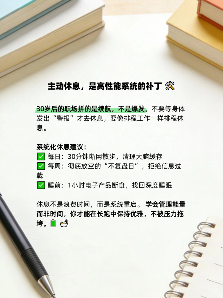 3️⃣ 休息主动化:把恢复精力当成任务,会休息才会赢。