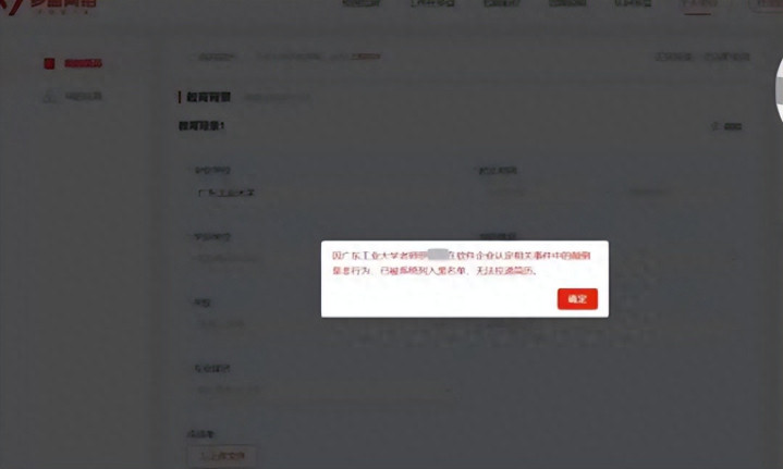 据红星新闻报道,近日,广东某高校的应届毕业生在某公司招聘官网投递简历时发现,在填写“教育背景”一栏时,系统弹出提示“因该校老师罗某某在软件企业认定相关事件中的颠倒是非行为,已被系统列入黑名单,无法投递简历”。