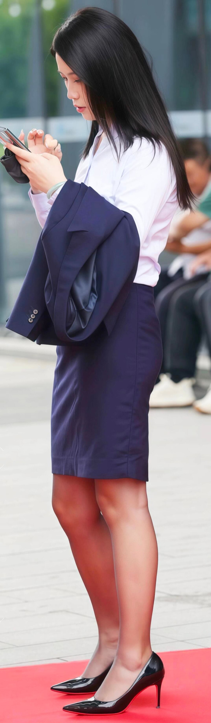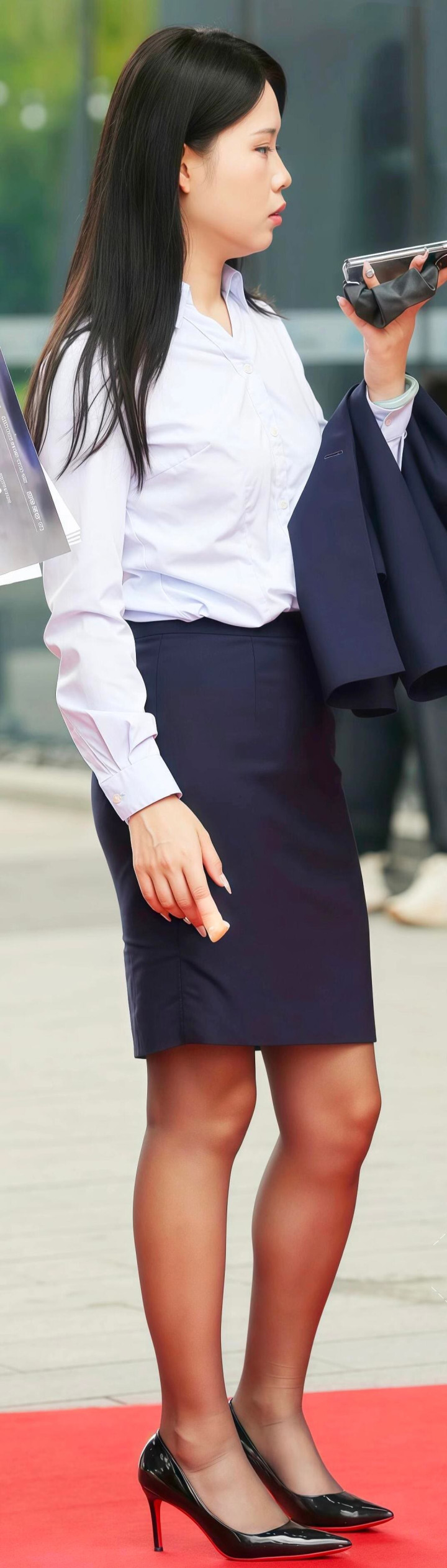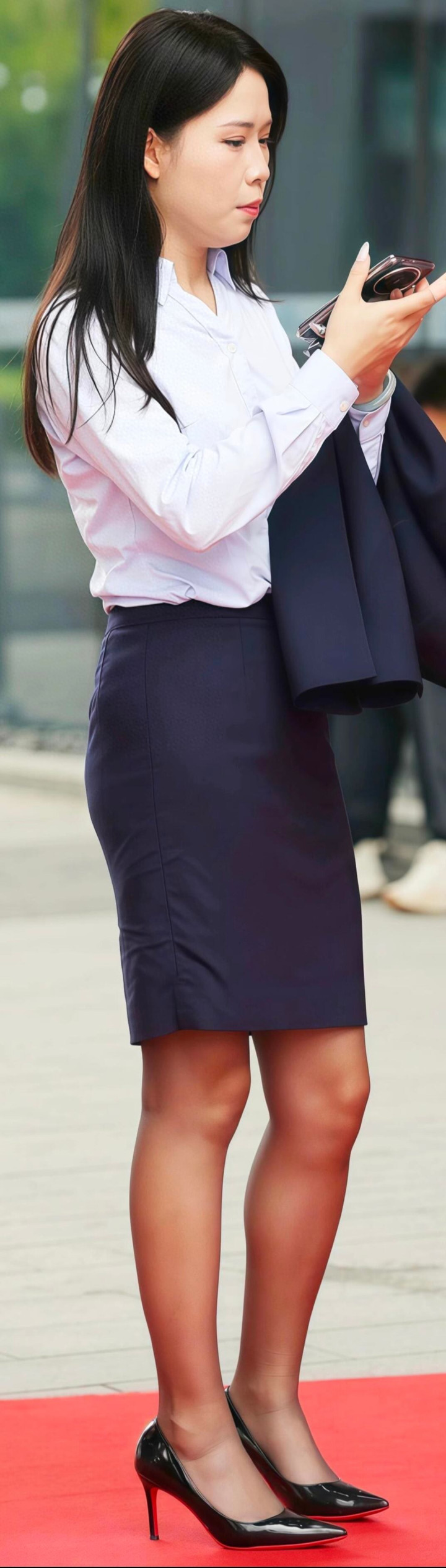 今天给大家带来是一款职场穿搭:白衬衫、深蓝色外套、深蓝半裙、细高跟鞋,不仅展现了职场女性的专业与自信,还透露出一丝优雅与时尚。