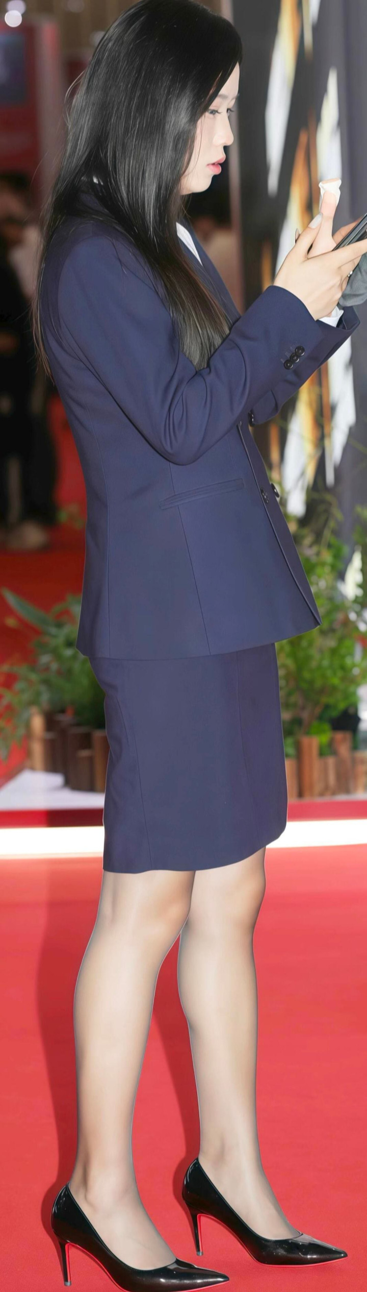 一双经典的黑色高跟鞋,鞋跟部分还点缀了红色元素,增添了一丝时尚感。高跟鞋不仅让她的步伐更加稳健,还让她在红毯上显得格外优雅。