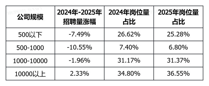 从招聘量来看,2025年全年,员工规模1万人以上的企业新发岗位量同比增长2.33%,成为唯一实现新发岗位量增长的企业规模类型。500人以下、500-1000人、1000-10000人企业的招聘需求均在收窄。2025年,万人以上的企业贡献了全行业36.55%的新发岗位量,高于2024年的34.80%。