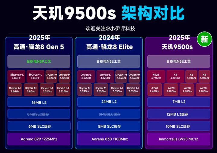 其中,天玑9500s的定位是和隔壁骁龙8 Elite类似,属于旗舰级SOC,定位要比隔壁高通新发布的次旗舰骁龙8 Gen 5高半头。