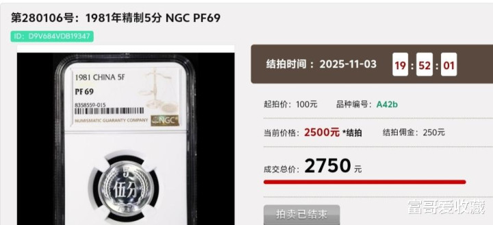 在2025年11月3日的“钱币拍卖会”中,一枚1981年的精制“5分硬币”,其NGC评级分数为PF69分,开云app最后拍出了2750元。