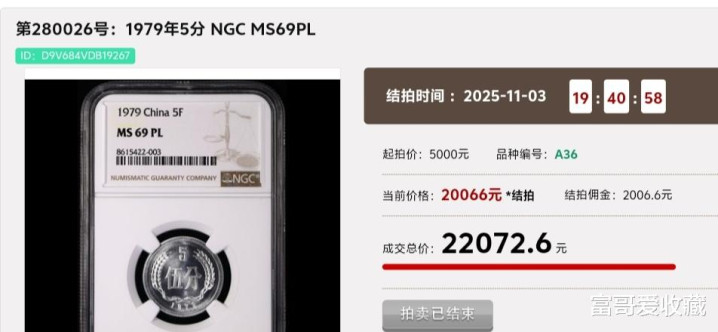 在2025年11月3日的“钱币拍卖会”中,一枚1979年的“5分硬币”,其NGC评级分数为MS69分(PL),最后拍出了22072.6元。