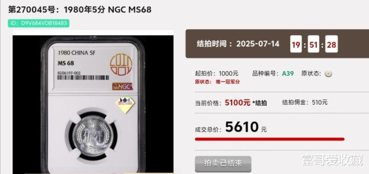 在2025年7月14日的“钱币拍卖会”中,一枚1980年的“5分硬币”,其NGC评级分数为MS68分,最后拍出了5610元。