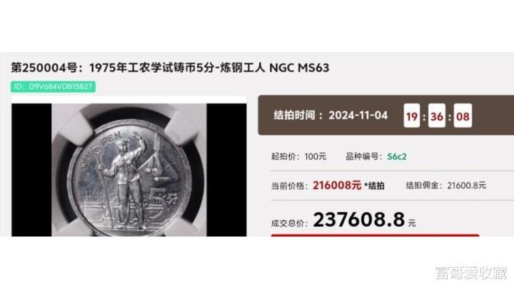 在2024年11月4日的“春秋大拍”中,一枚1975年的“工农学试铸币5分”(炼钢工人),其NGC评级63分,最后却拍出了237608.8元。