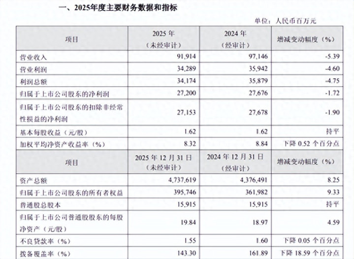 中原银行公布了2025年龄迹快报,2025年交易收入919.14亿,同比下跌5.39%,包摄于鼓励净利润272亿,同比下跌1.72%。加权平均净钞票收益率8.32%,同比下跌了0.52个百分点。