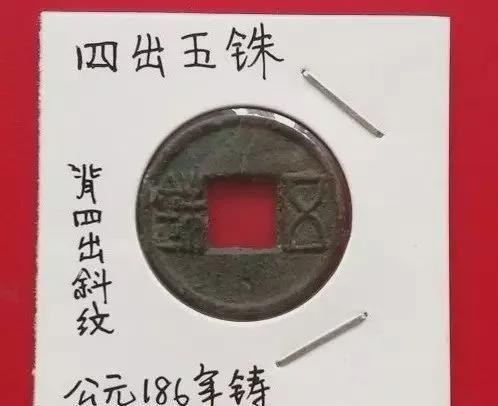 东汉末年,宦官、外戚专权,政治黑暗,危机四伏。汉灵帝三年,开始铸行四出五珠钱(图3、图4)。所谓四出,是指在钱币背面,有四道斜纹从穿孔四角连接外廓,这种钱币又被称为角钱。该钱的铸行,本来是有积极意义的,因为当时五珠钱已经流通两百多年了,但其在形式上基本没有变化,而这次在钱背加铸四出纹,是对以往形制的一种突破。但是它却生不逢时,被说成是亡国之兆。当时不少人散布言论,称此钱表示,“当权者,奢靡已甚,形象兆见,此钱成,必四道而去。”钱币既然四道而去,那么国家空虚,也必将灭亡。