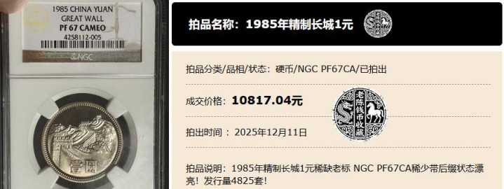就在昨天,也就是12月11号,一枚NGCPF67CA(老标)的1985年精制长城1元,最后拍出了10817.04元的高价,比面值增长了一万多倍。