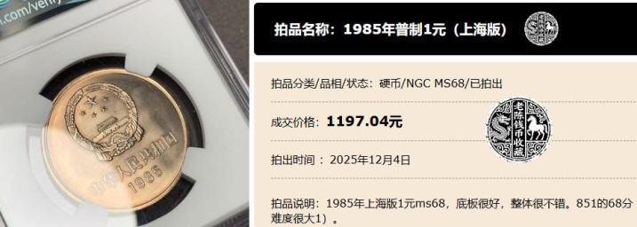 比如说,在这个月的4号,一枚经过NGC评级、达到了MS68分的1985年长城1元普制币,就拍出了1197.04元的高价。